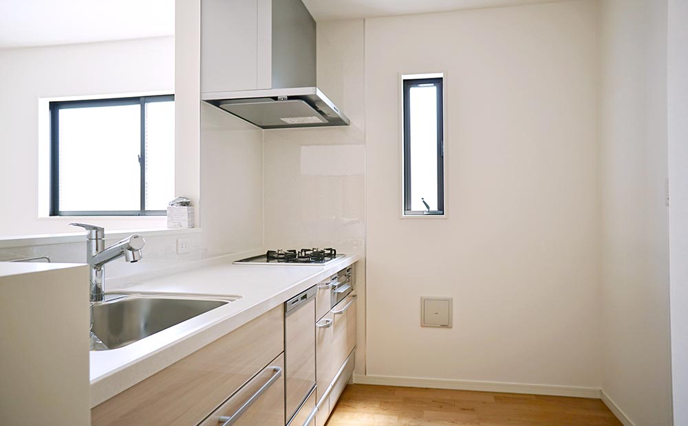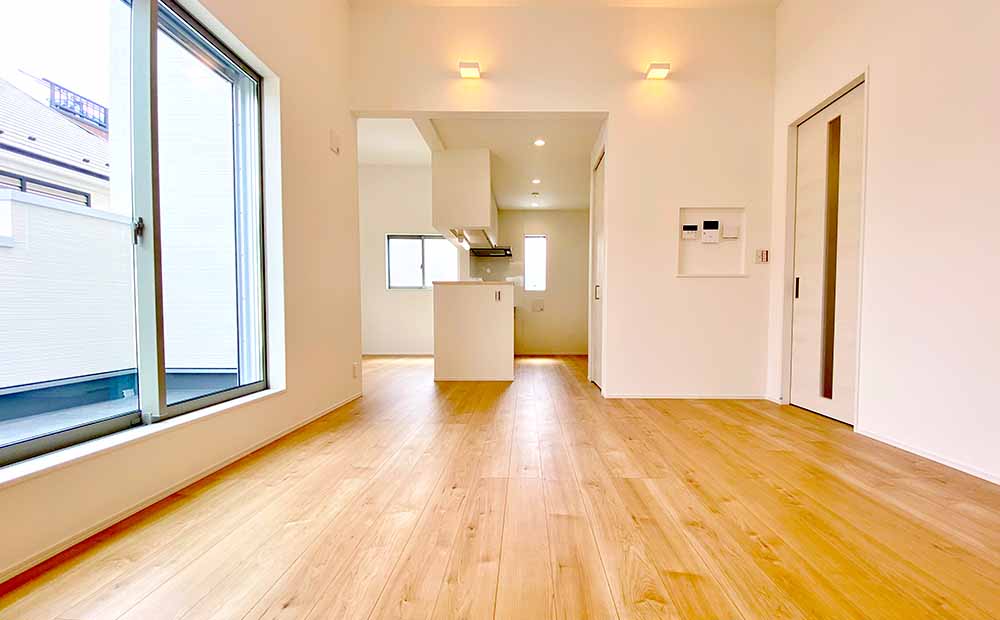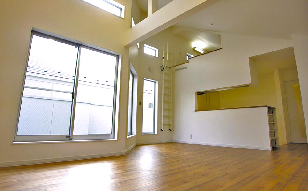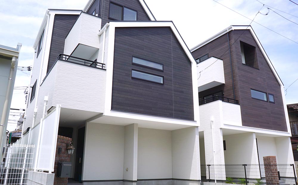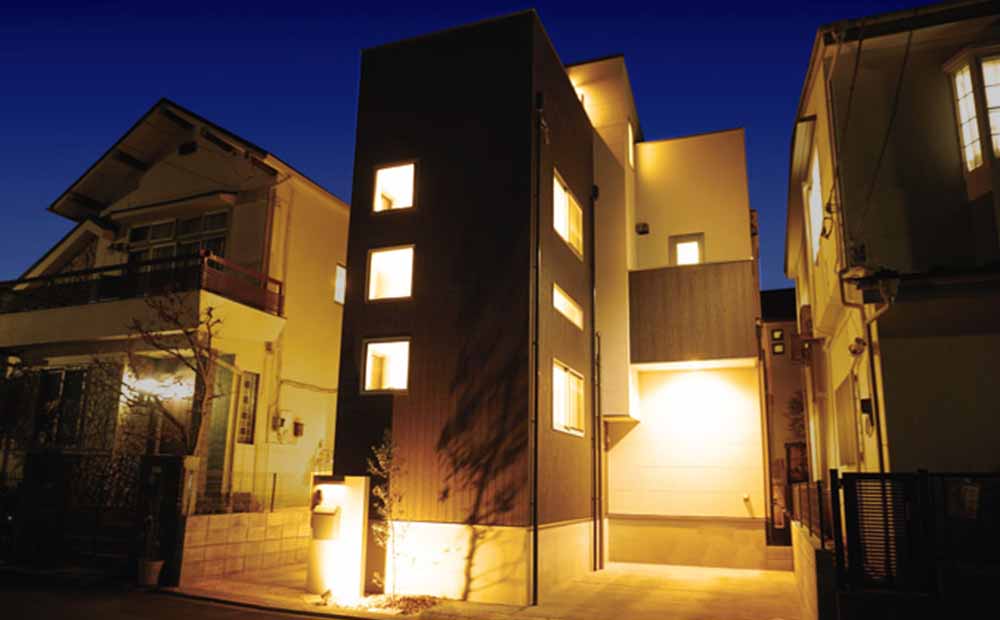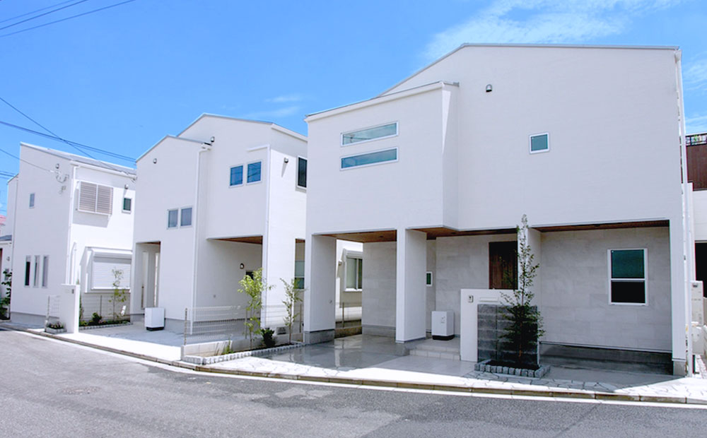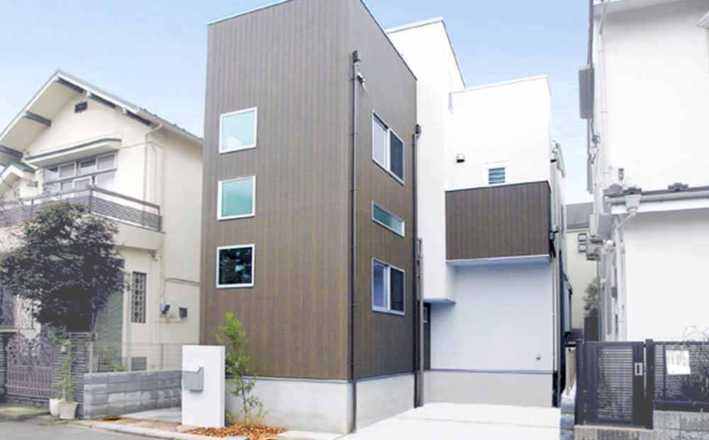 副都心線駅7分にある、三階建ての邸宅です。130㎡超えの延べ床面積を確保し、各居室に十分な大きさと収納を設けました。また、駐車スペースも二台分確保しています。