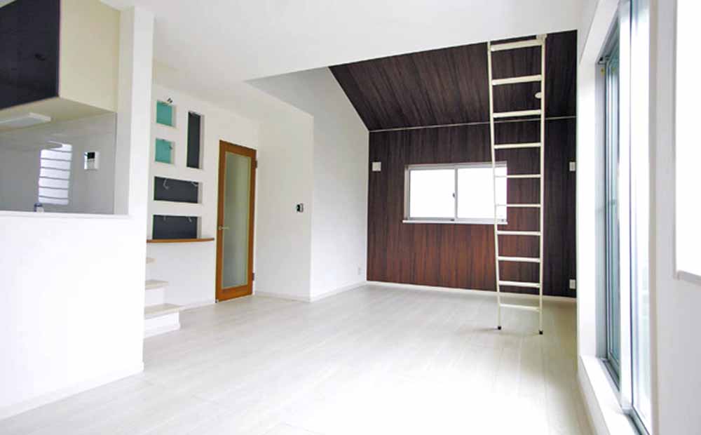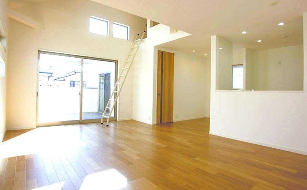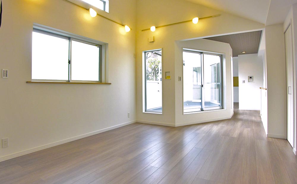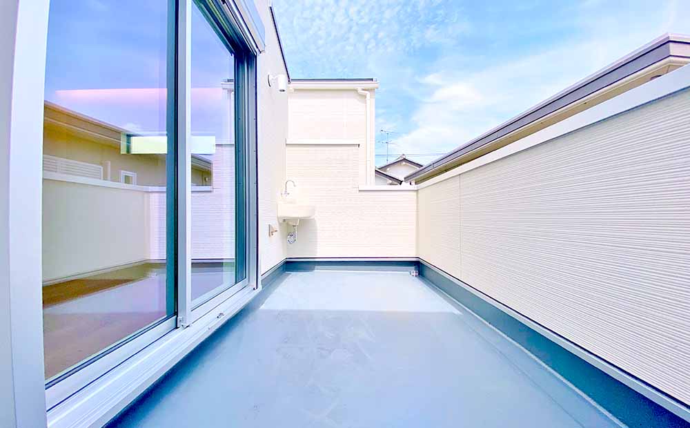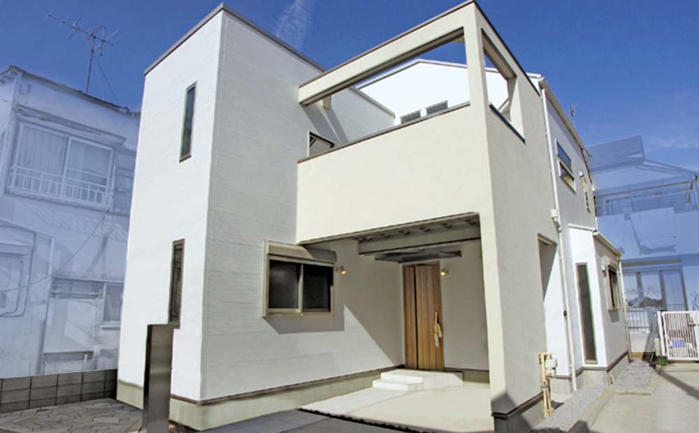 南道路の日を受けて明るく映える白い家です。リビング20畳と完全につながる8畳のバルコニーで、計28畳の生活空間を確保しました。