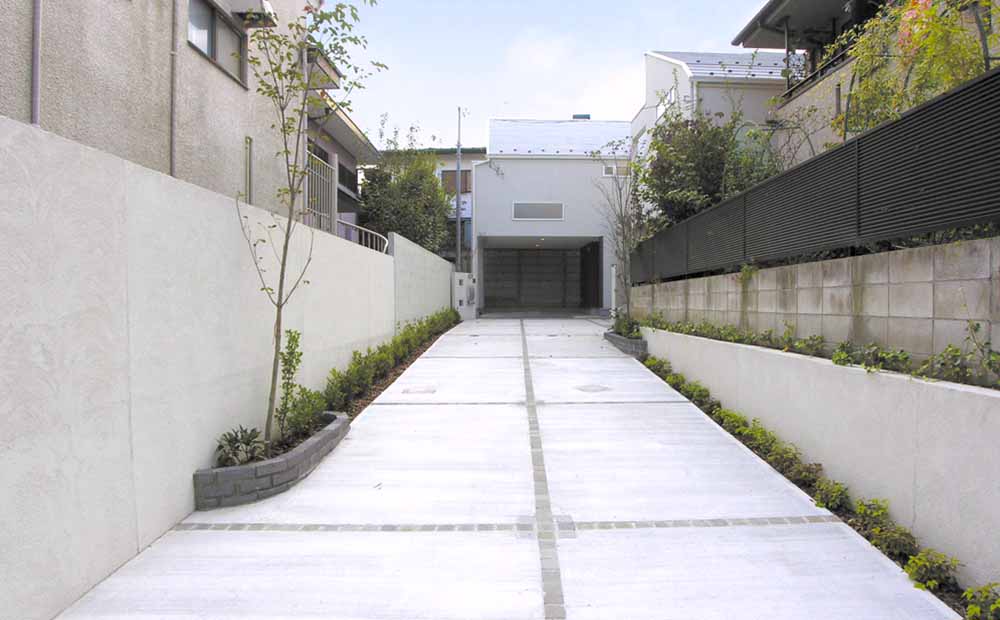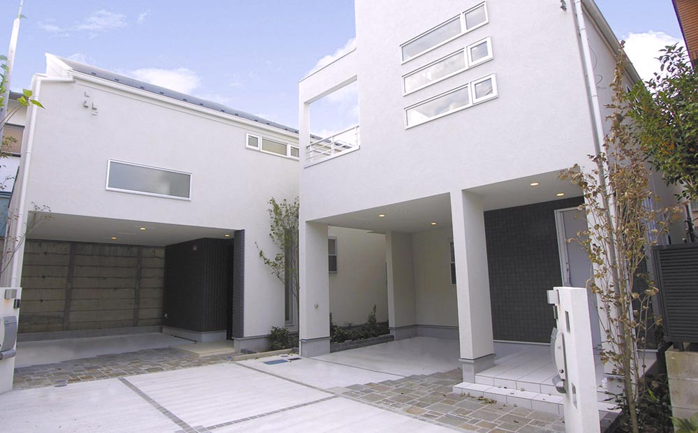 板橋区の高級住宅街に位置する、土地面積の大きな、4m幅の旗状敷地に建設した邸宅です。通路部分を協定通路にして、プライベート感のある二棟現場をつくりました。