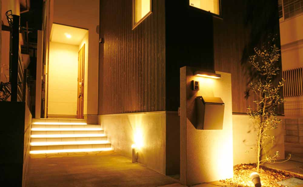 8m以上の前面道路に面したナチュラルモダンな邸宅です。外構ではライティングにこだわることで、表情のある素敵な雰囲気に仕上がりました。